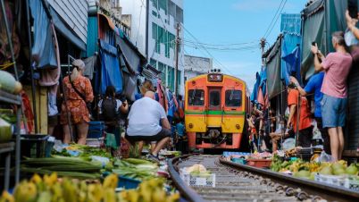 Екскурзия до Плаващия пазар Дамноен Садуак. Плаващите пазари на Тайланд имат културно значение в страната и остават неразривна част от традициите на народа. Пътуването до този тайландски феномен е като да се върнете в древните времена на Сиамското кралство, където цветно облечени търговци гребат по тесните канали. Ще станете свидетели на традиционните начини за търговия с плодове, зеленчуци и други дребни предмети от малките лодки. Типичната архитектура на къщите допълнително придават особен чар на мястото, а лодките продължават да бъдат жизненоважен вид транспорт за местните в ежедневието им. Ще посетите и известната железопътна линия Maeklong, където сергиите са издигнати край релсите и набързо се преместват, когато влаковете пристигат.