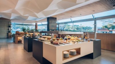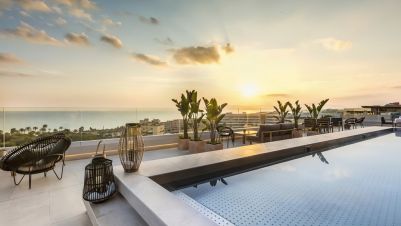 На територията: Освен с невероятните гледки към Средиземно море от панорамната и слънчева тераса, хотелът разполага с основен ресторант със сутрешен бюфет и разнообразие от барове включително рууфтоп бар , пуул бар, снак бар и кафене. За релаксация хотелът предлага с 3 басейна - басейн на покрива със зашеметяваща гледка, закрит басейн, утопляем басейн и джакузи. Спа центърът разполага със сауна, парна баня и възможност за различни масажни процедури. В хотела има и добре оборудван фитнес център плюс зала за допълнителни тренировки. Хотела предлага възможности за наемане на автомобили и велосипеди.